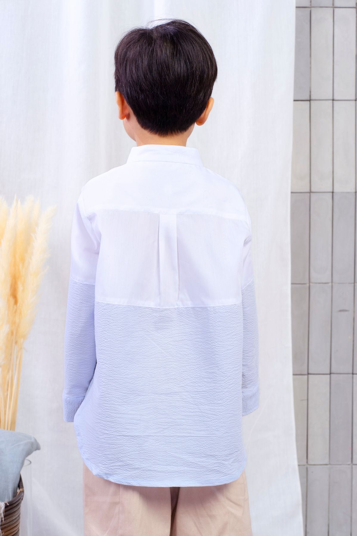 The Alli Shirt is a timeless long-sleeve shirt designed for boys who appreciate both elegance and comfort. Featuring a dual-color design, it beautifully combines crisp white fabric with an exquisite baby blue fabric, creating a refined and polished look.