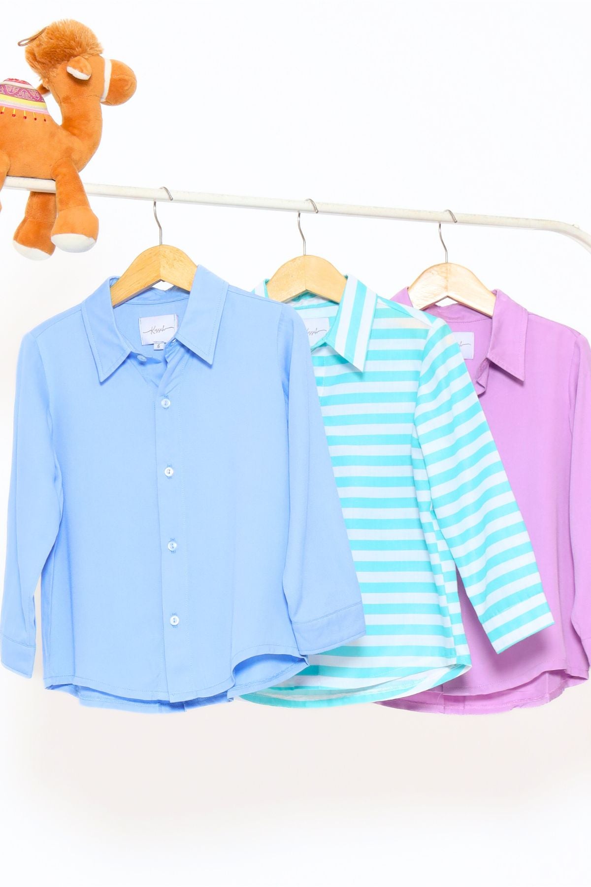 Available in three eye-catching colors — lilac, blue, and striped tosca — this shirt brings a splash of fun into every outfit.