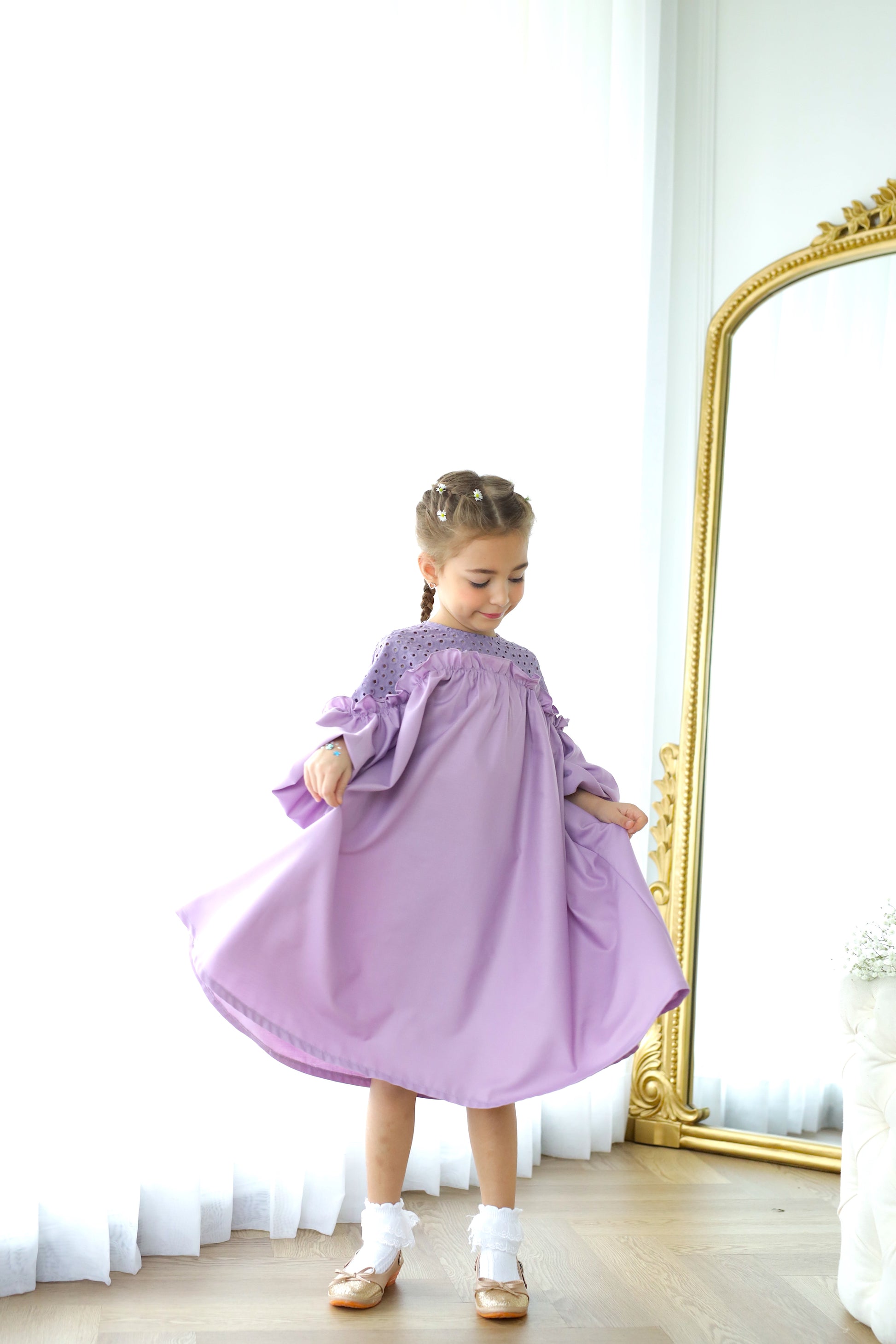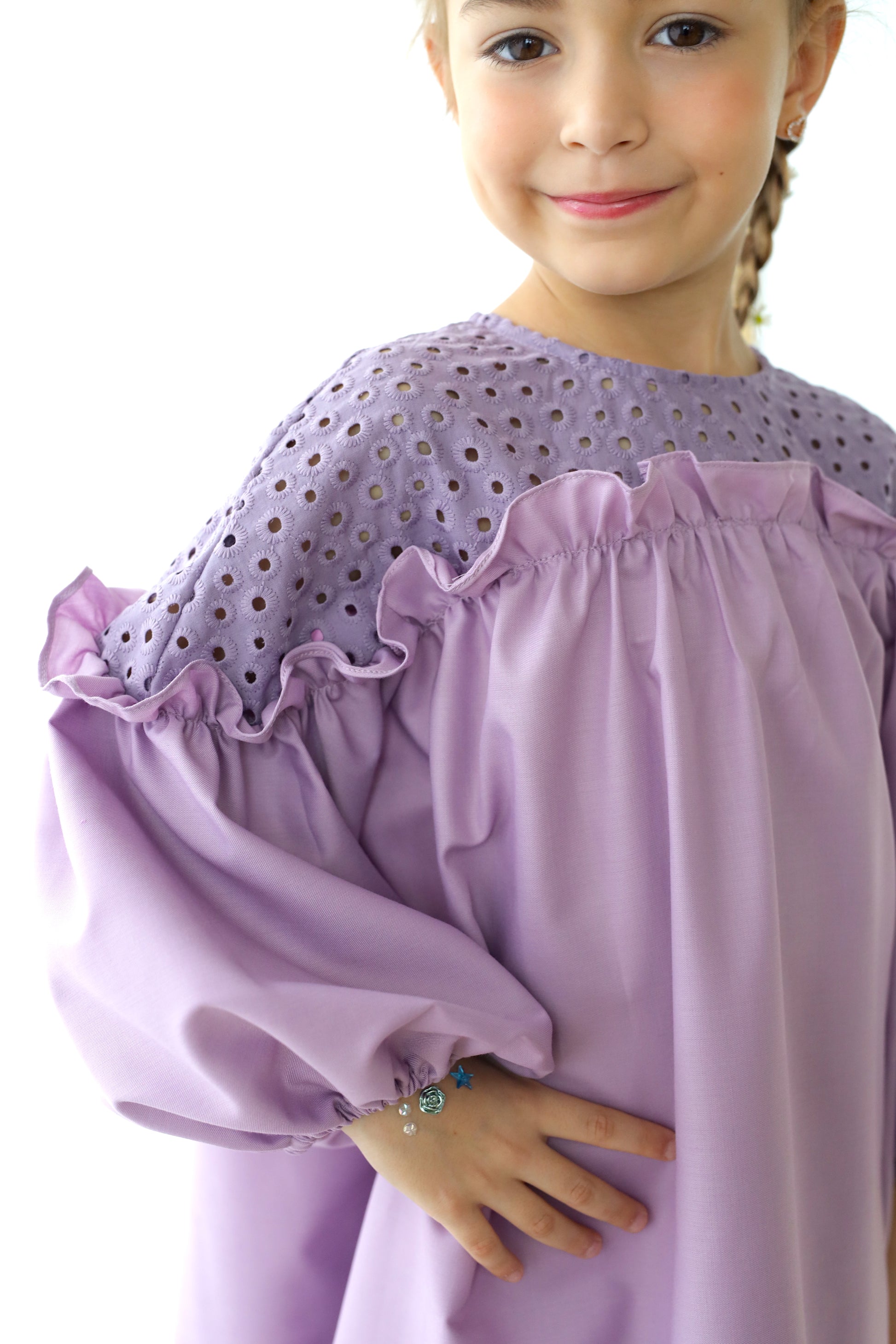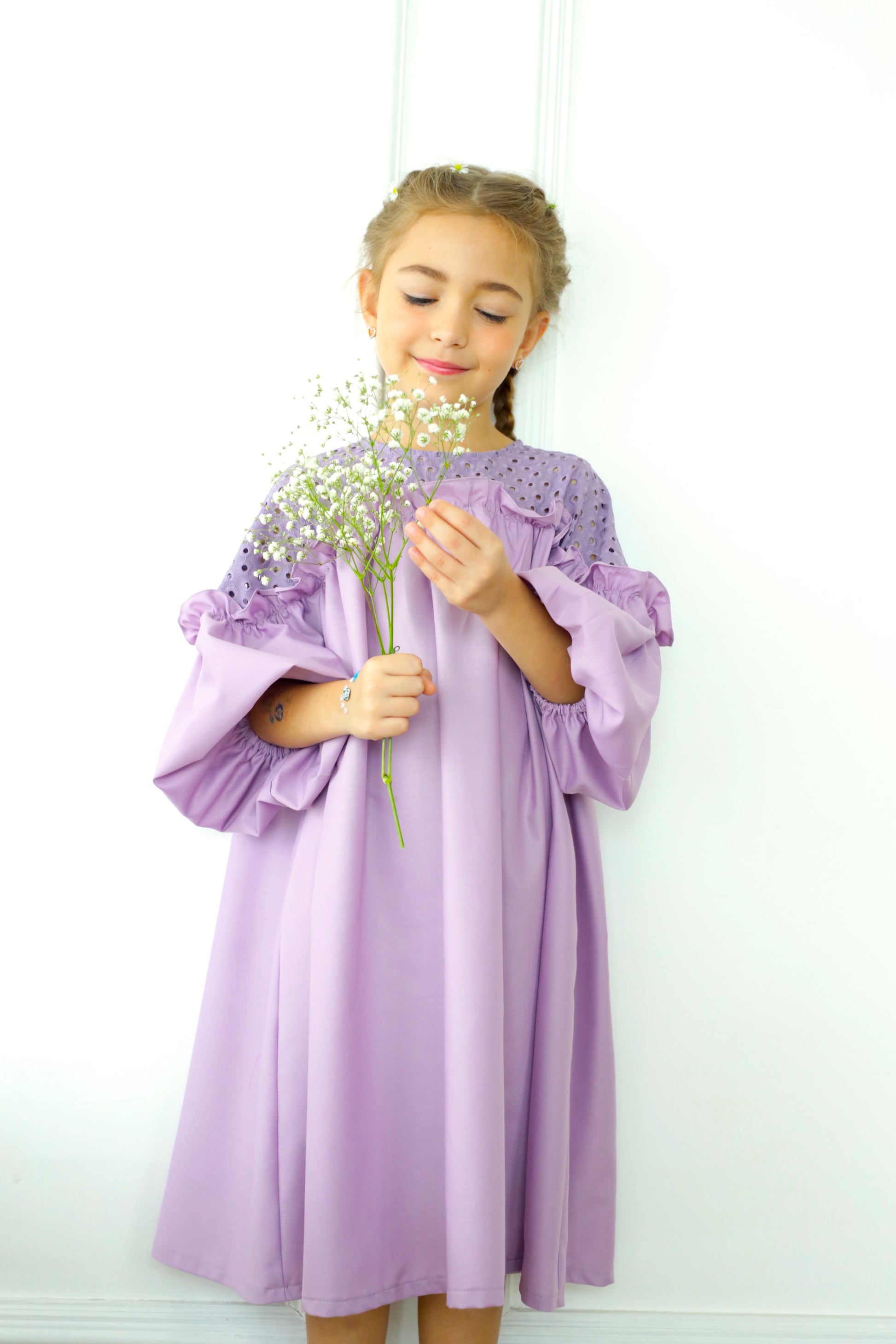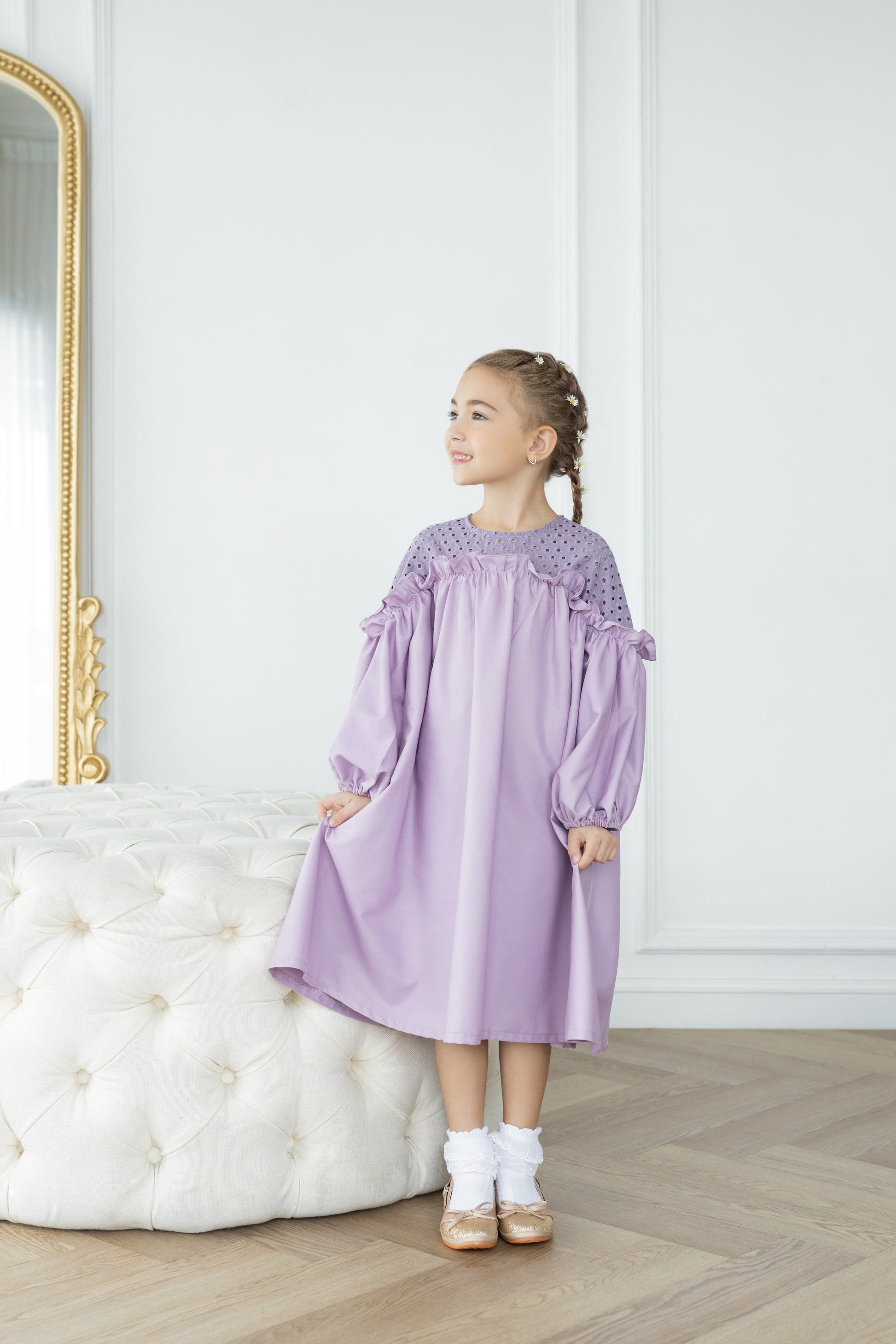 - Walk with confidence in this soft beautiful flowy dress. In a midi length with easy pull-over style, plus beautiful details on top, it's a must for their daily wear. Girl Dress at its best