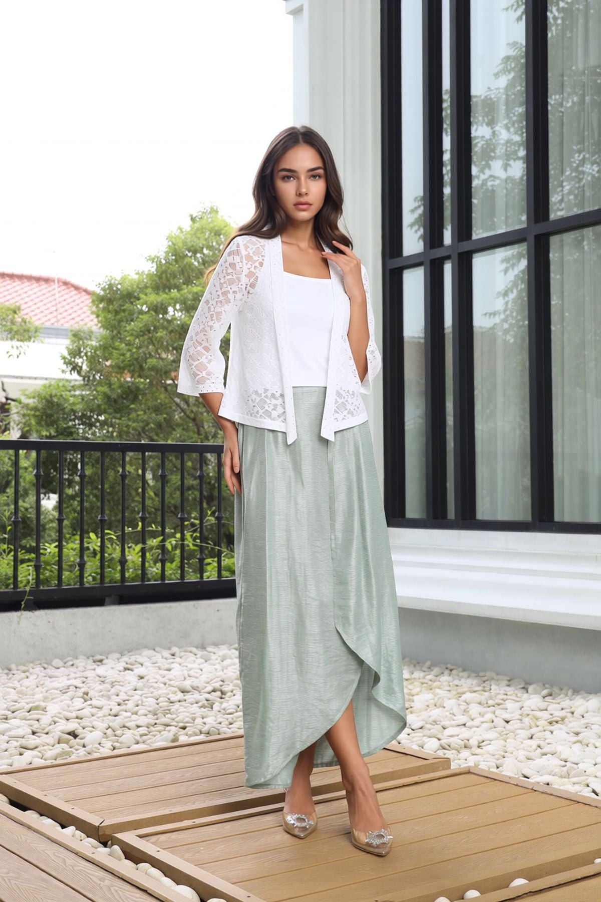 The set pairs a beautifully tailored top with a matching skirt, creating a look that is effortlessly polished yet comfortable for long gatherings and prayer evenings. Available in a serene white or calming green top option, each shade reflects the purity, renewal, and tranquility of the Ramadhan season.